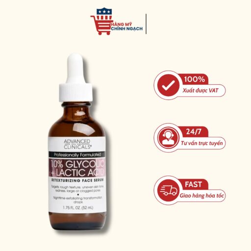 Serum tẩy tế bào chết sáng da Advanced Clinicals 10% Glycolic + Lactic Acid Serum 52ml