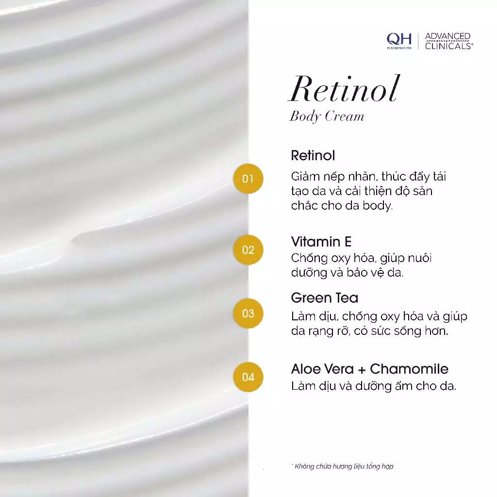 Kem dưỡng thể Advanced Clinicals Retinol Body Cream 59g giúp cung cấp độ ẩm và dưỡng chất cho da nhờ sự kết hợp của Retinol cùng các thành phần dưỡng ẩm. Retinol hỗ trợ cải thiện kết cấu da và giúp bề mặt da trông mịn màng hơn khi sử dụng đều đặn.